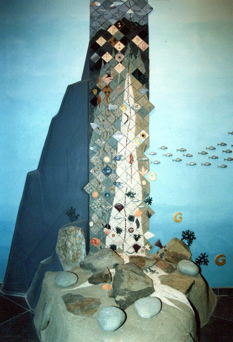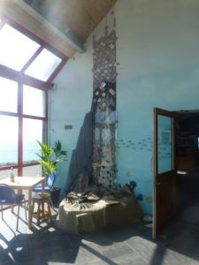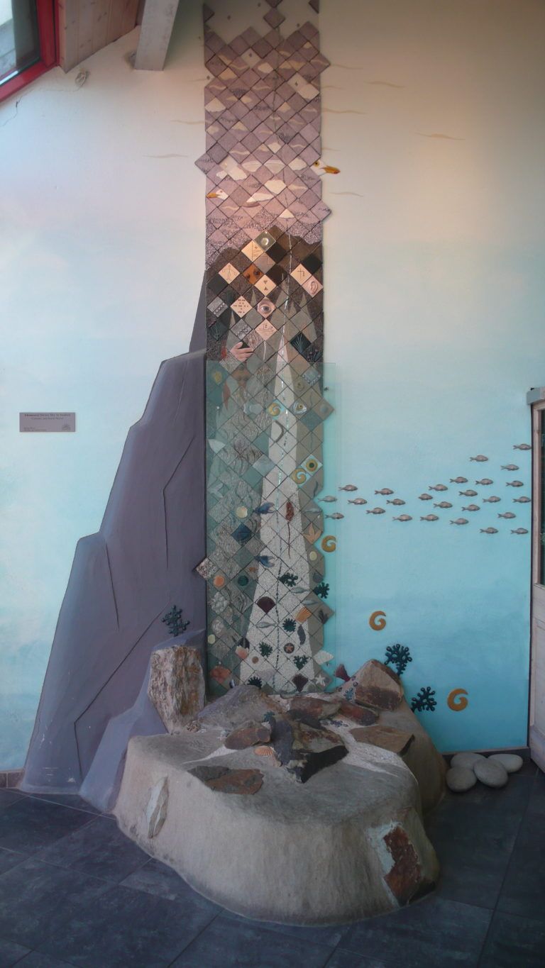 This is a mixed media mural depicting a segment of life on the tip of The Mizen peninsula, from the sky to the bottom of the sea, like a textbook geological stratum. It has all been executed in clay, crushed local rocks and shells. There is however one real shell. Can you find it? The “elements” can mean the components of The Mizen, or the “elements” can mean the weather. How many elements can you see? What does the Morse code or the semaphore say? Some of the sky level elements are: clouds, sea gulls, feathers, mist.